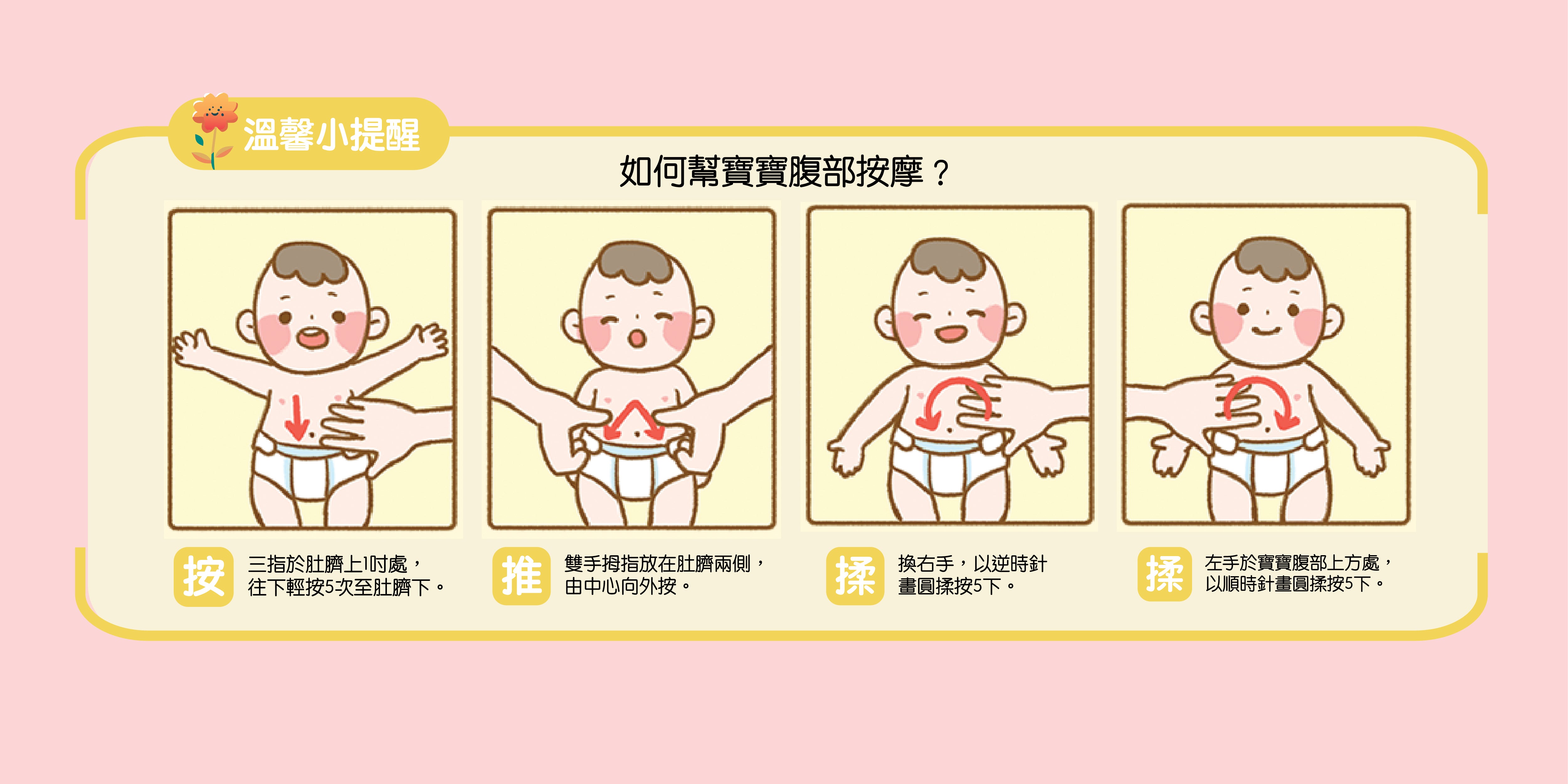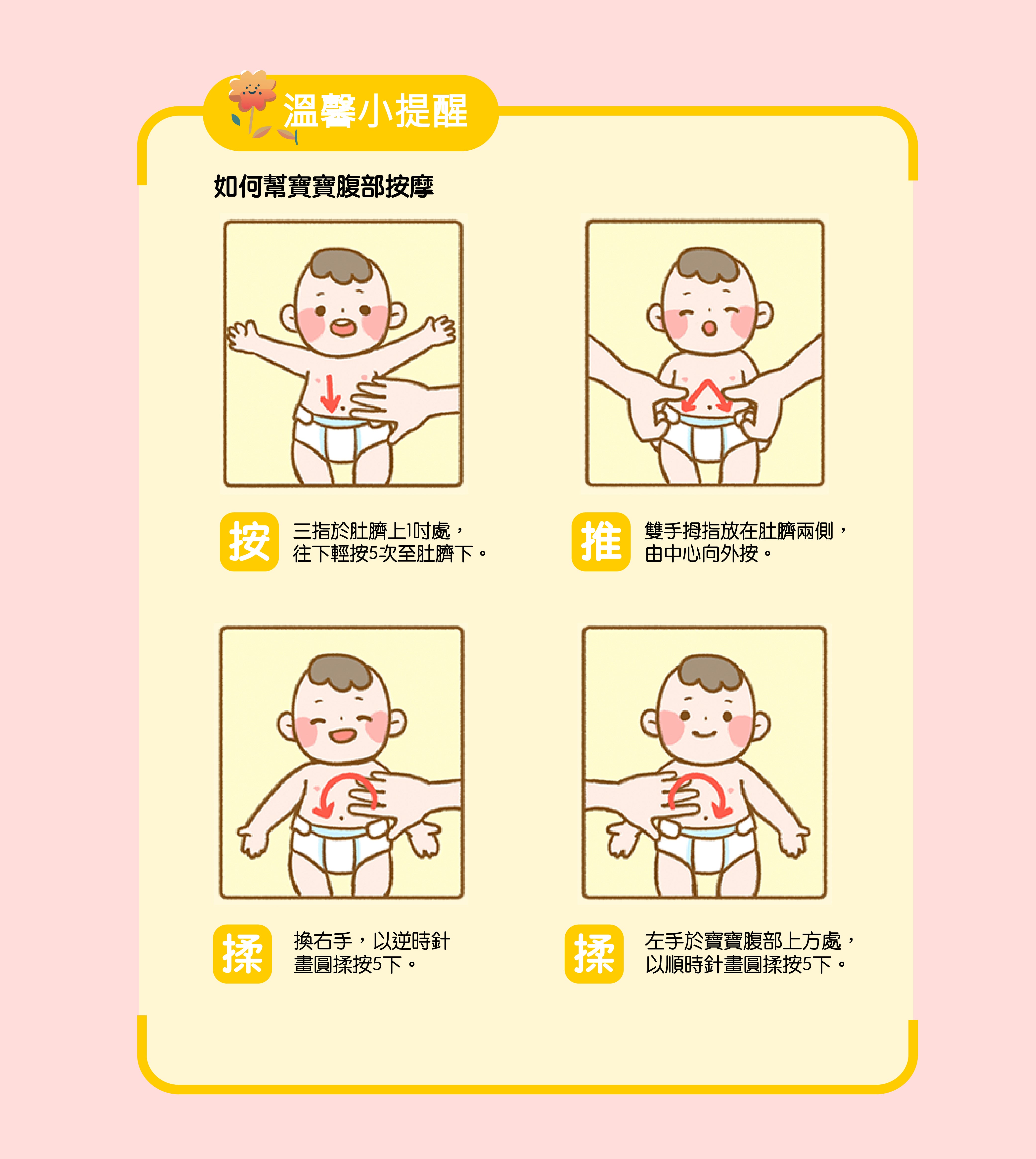 爸爸媽媽可幫寶寶按摩腹部,踢腿,幫助腸道蠕動。
